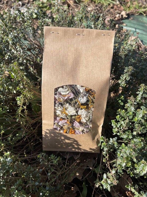 Composition : lavande fleurs, plantain lancéolé fleurs, mauve fleurs, camomille romaine, souci fleurs, sarriette feuilles, thym feuilles