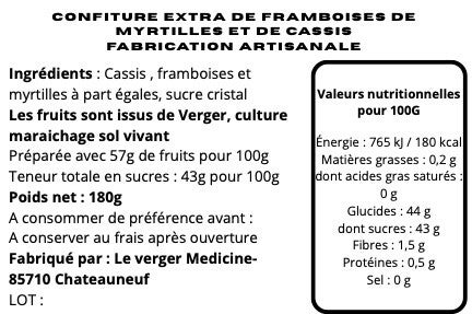 composition : myrtilles,cassis et framboises à part égales, sucre